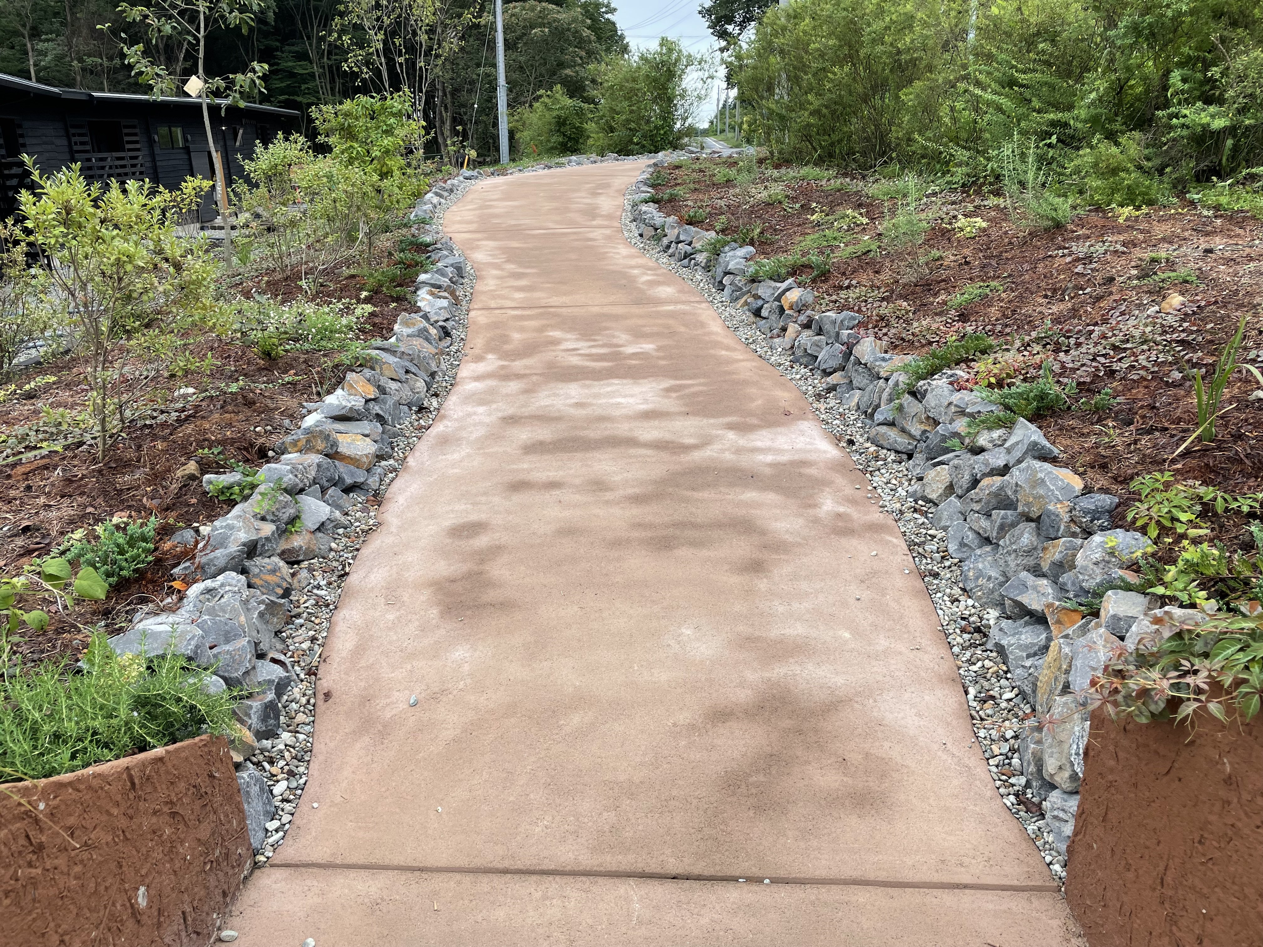 スロープのエコグローブ練り工法 商業施設のスロープにエコグローブ練り工法を採用していただきました。狭い場所や施工スペースが限られた場所は、エコグローブ練り工法が適しています。景観に調和していると思いますがいかがでしょうか? 両側の空石積みも当社で施工致しました。福島県で採れる鮫川石を使用しています。