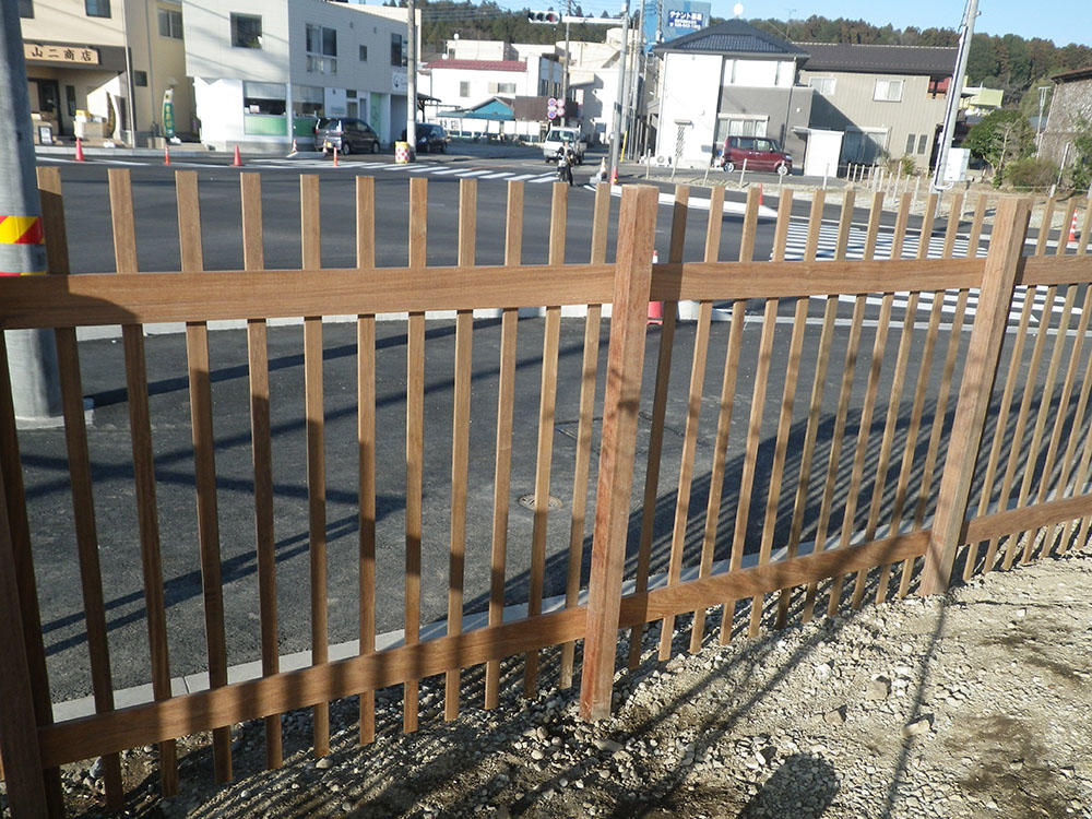 (写真はウッドフェンスでの使用例:支柱がトンカビーン、ルーバーはイペ)