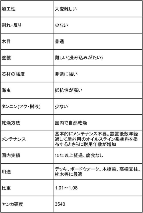 イペと同等の硬さと耐久性があり、重く加工は難しいですが割れや反りが少なく、木目もイペと似て綺麗です。