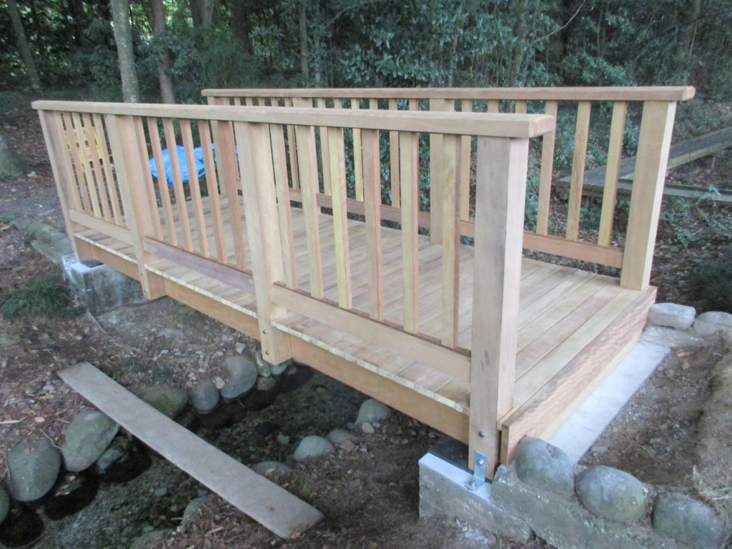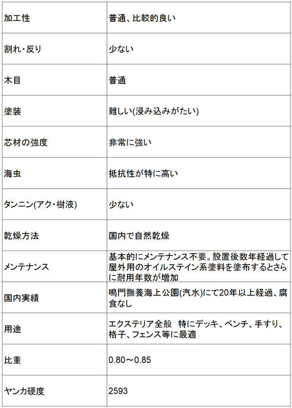 グリーンハートは、南アメリカ原産の木材の名称のひとつです。主にガイアナやブラジルが産地です。反りやねじれが少なくトゲが立ちにくいのが特徴です。ハードウッドの割には軽量で、比較的加工がしやすいという利点もあります。デッキの床板には特に適しています。
