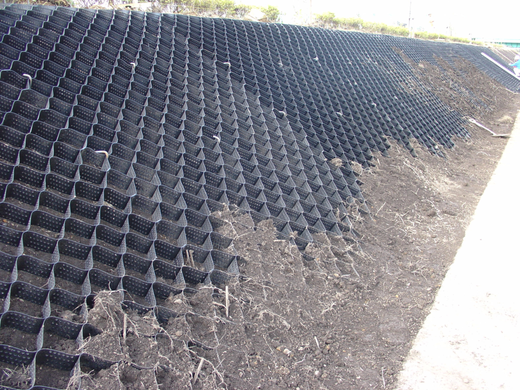 のり面にテラセルを固定し、ハニカム状のセル内に充てん材を入れて安定させることで、のり面の浸食を防止しのり面の保護や早期緑化を可能とします。
