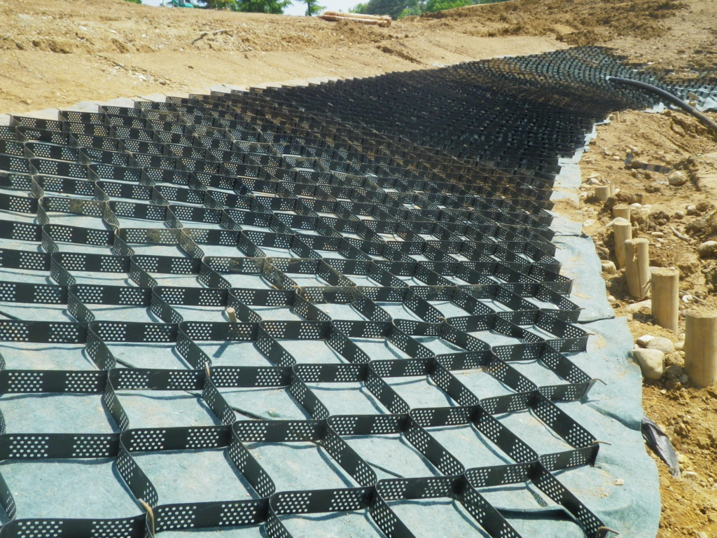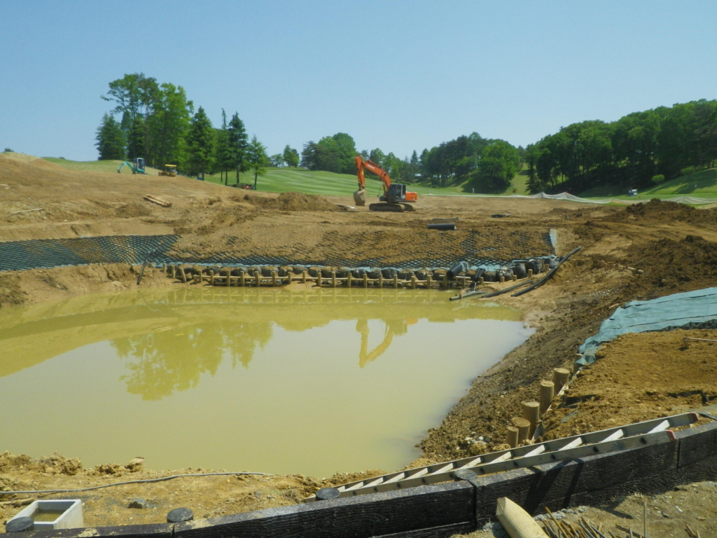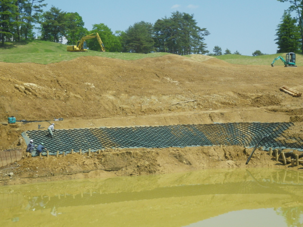ゴルフ場内調整池の法面保護にテラセルを使用した事例です。
