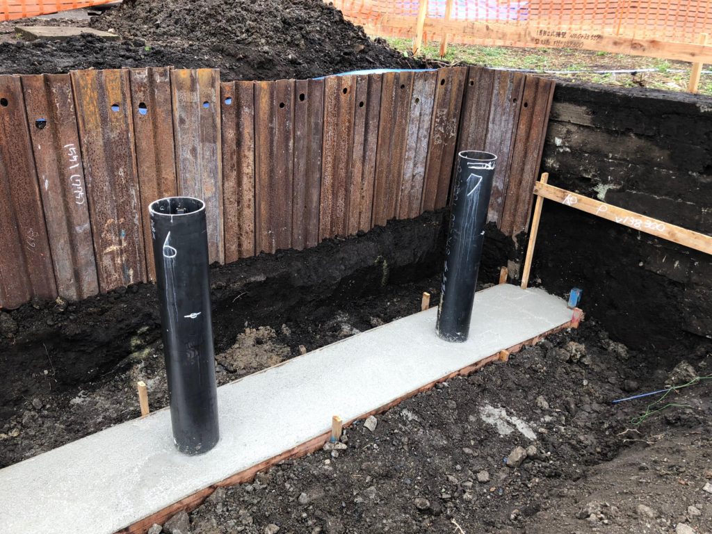 シートパイルと建込簡易土留めで切り土された部分に擁壁が建ちます。まずは地盤改良及び鋼管を建込ます。
