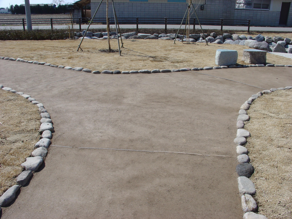 真砂土(山砂)を使用しています。アスファルトやコンクリートのように、人工的な舗装と感じられません。また、歩いたときの踏み心地が柔らかく、遊歩道やアプローチには最適です。