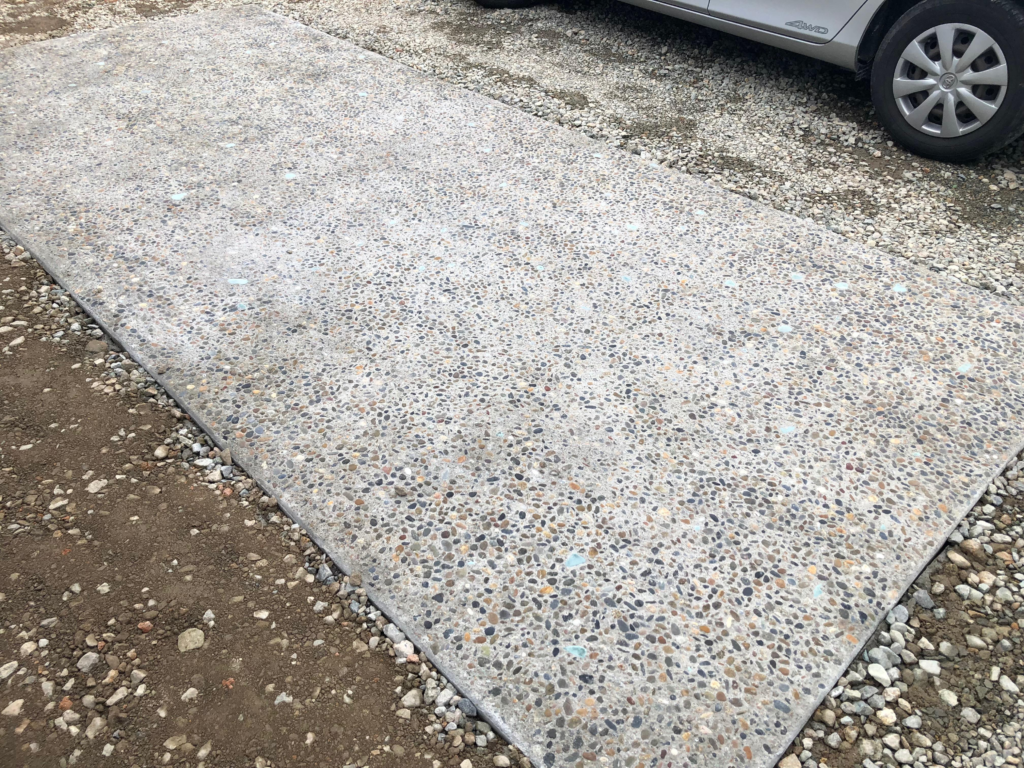 通常は、下地コンクリートの上に2~3cm程度の厚みで種石入りモルタルを上塗りし洗い出します。