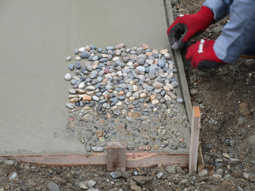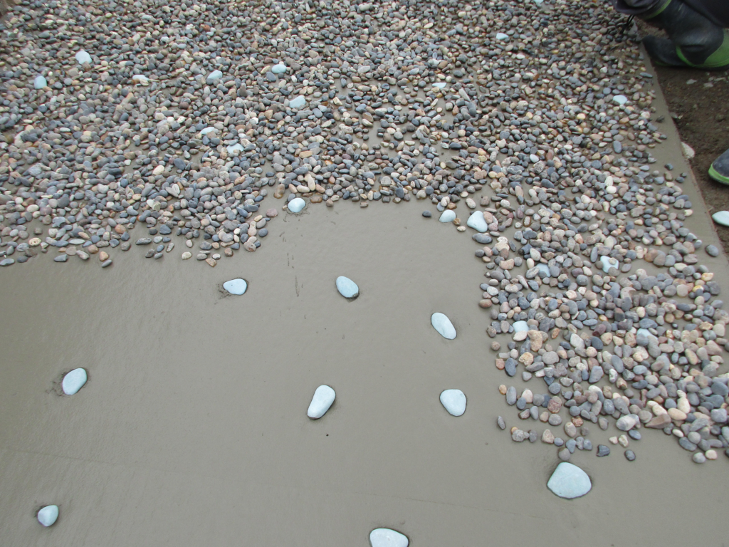 今回の工法は、土間コンクリート打設と種石による化粧を同日に行います。