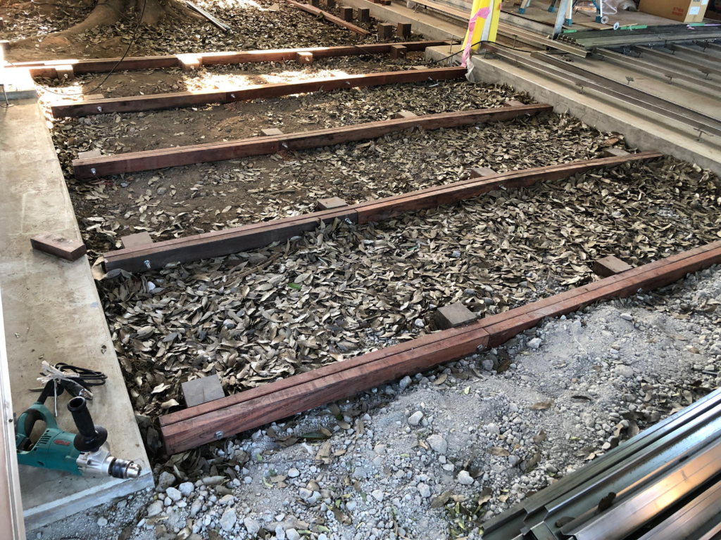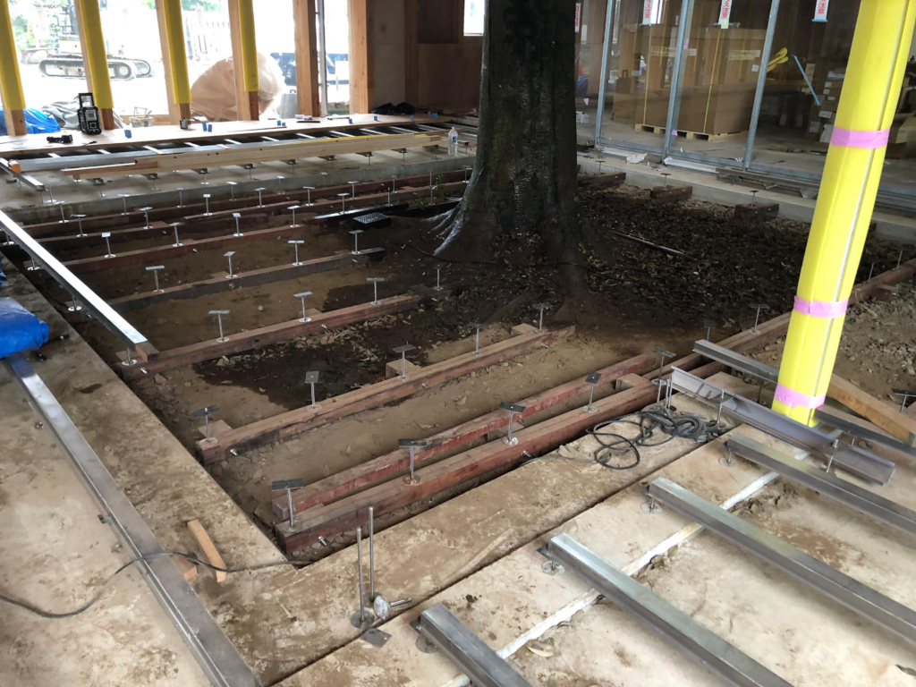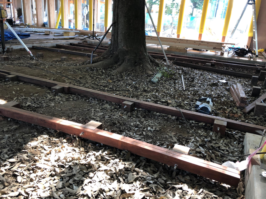この部分はケヤキの既存樹があり、樹木成長の妨げとならないよう井桁基礎工法が採用になりました。