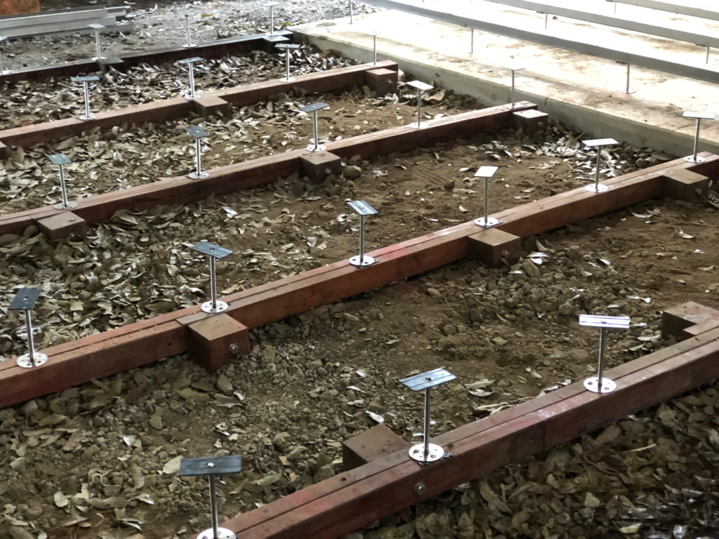 ステンレスのプレート付きボルトとナット付きの根太受けです。この上に鋼製根太と床板が載ります。