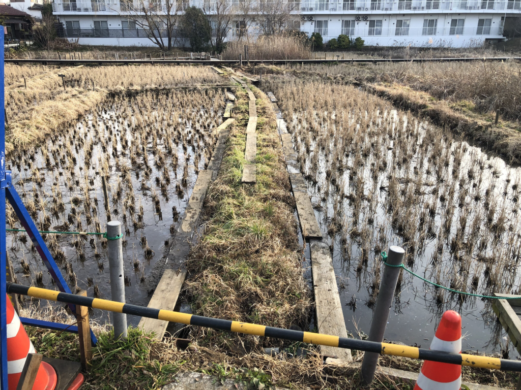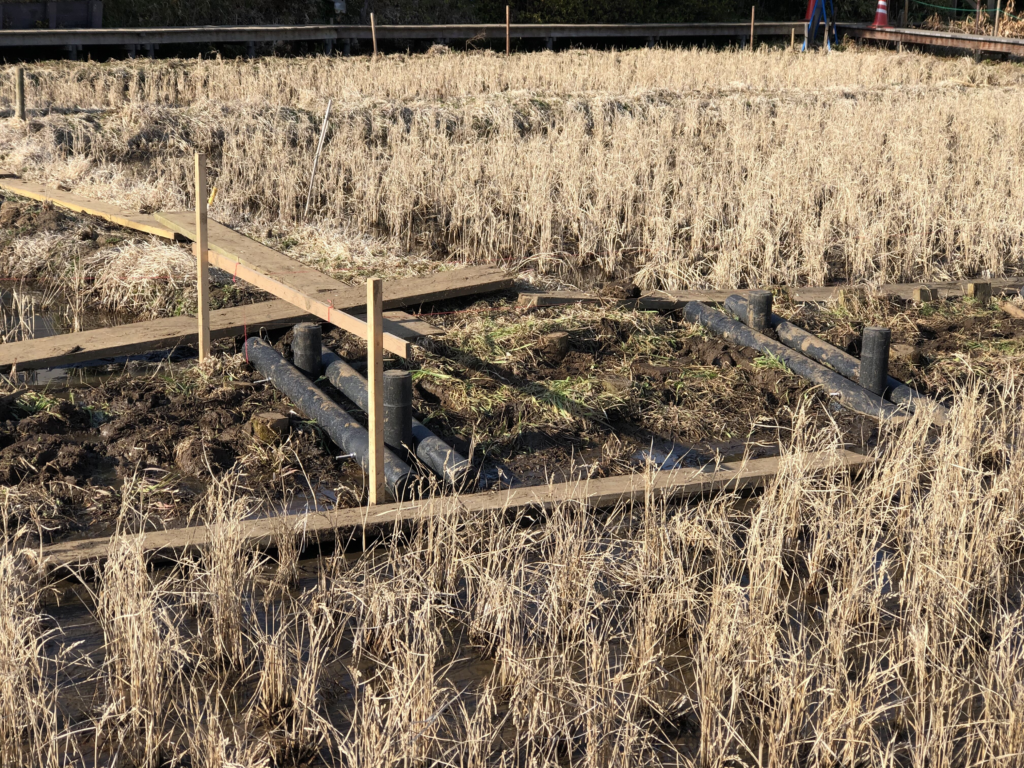 ビオトープ空間での木道改修に井桁基礎工法が採用されました。