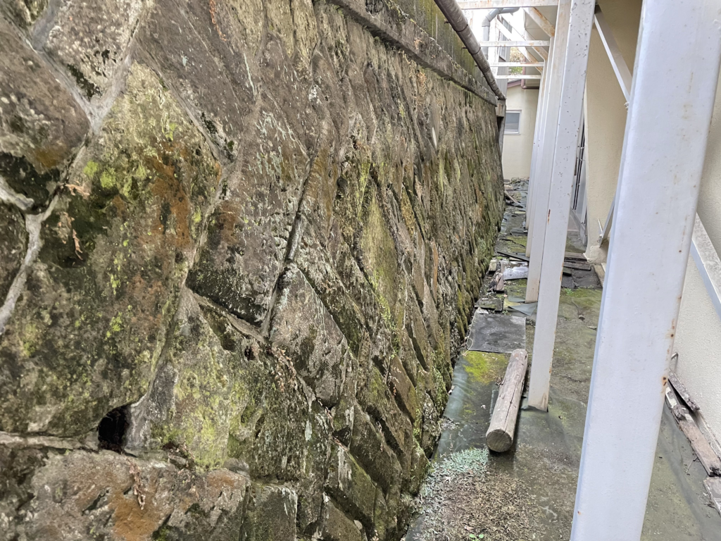 空石積み擁壁が膨らんできている狭小地で、擁壁の補修を行いました。