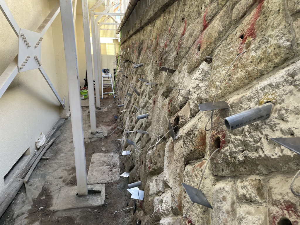 具体的にはアースアンカーを打設し、その表面に断面補修用のモルタルを塗りつけます。