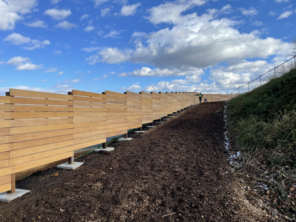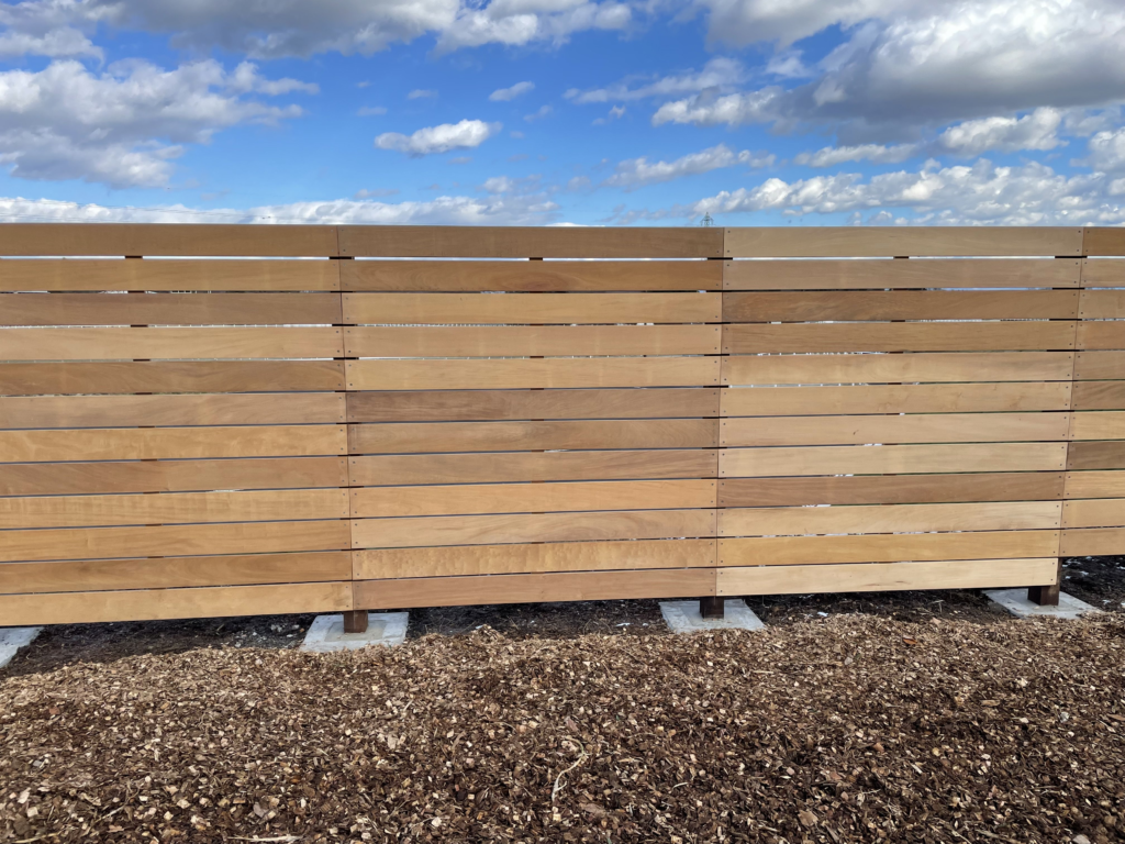 そのうちの一部ですが、馬が高低差を怖がらないための目隠しフェンスに当社取り扱いのハードウッドが採用されました。