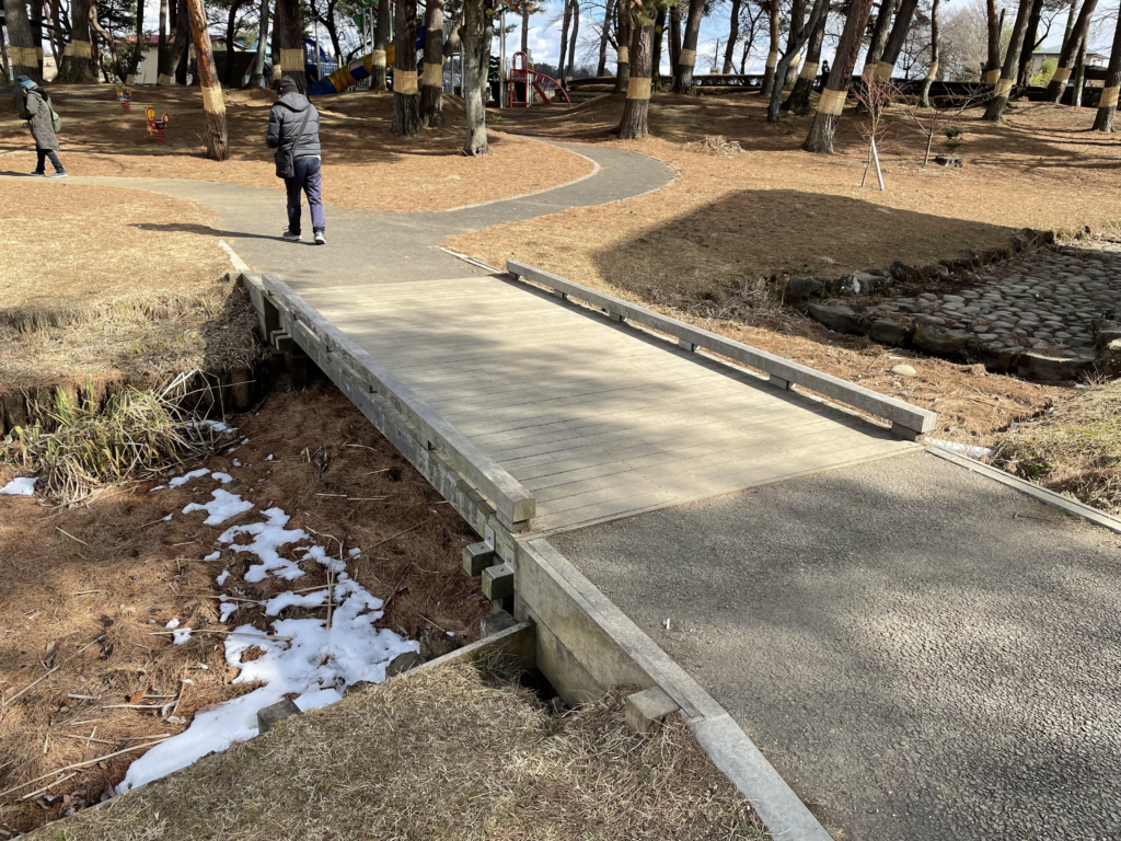 木橋自体が沈下している様子はなく、井桁基礎の有効性が確認できます。
