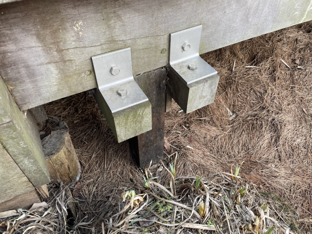 ケブラッチョコロラド材の支柱、その上部はグリーンハート材による施工です。