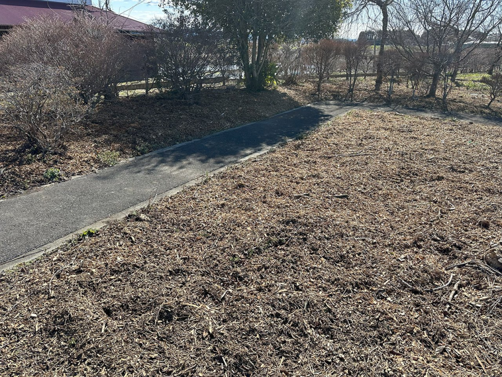 伐採した枝葉はウッドチップにして墓園の間地に敷均しています。