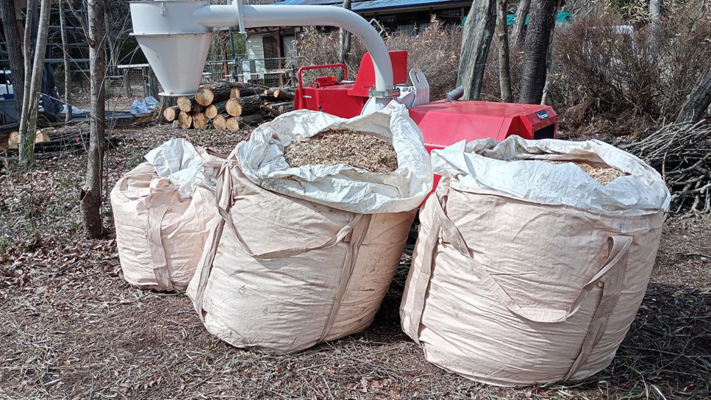 2トンダンプ3台分くらいのボリュームの枝葉が大型土のう(1トンフレコンバッグ)2袋半になりました。