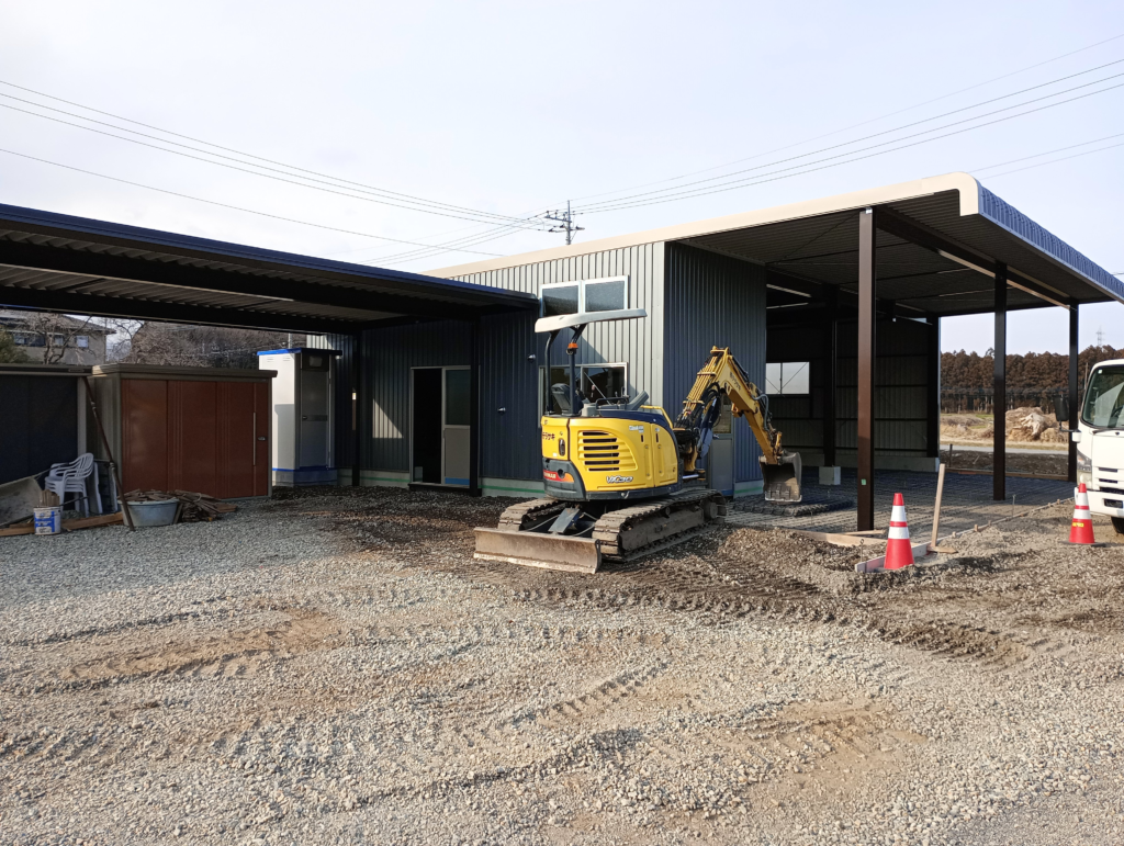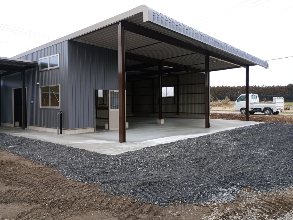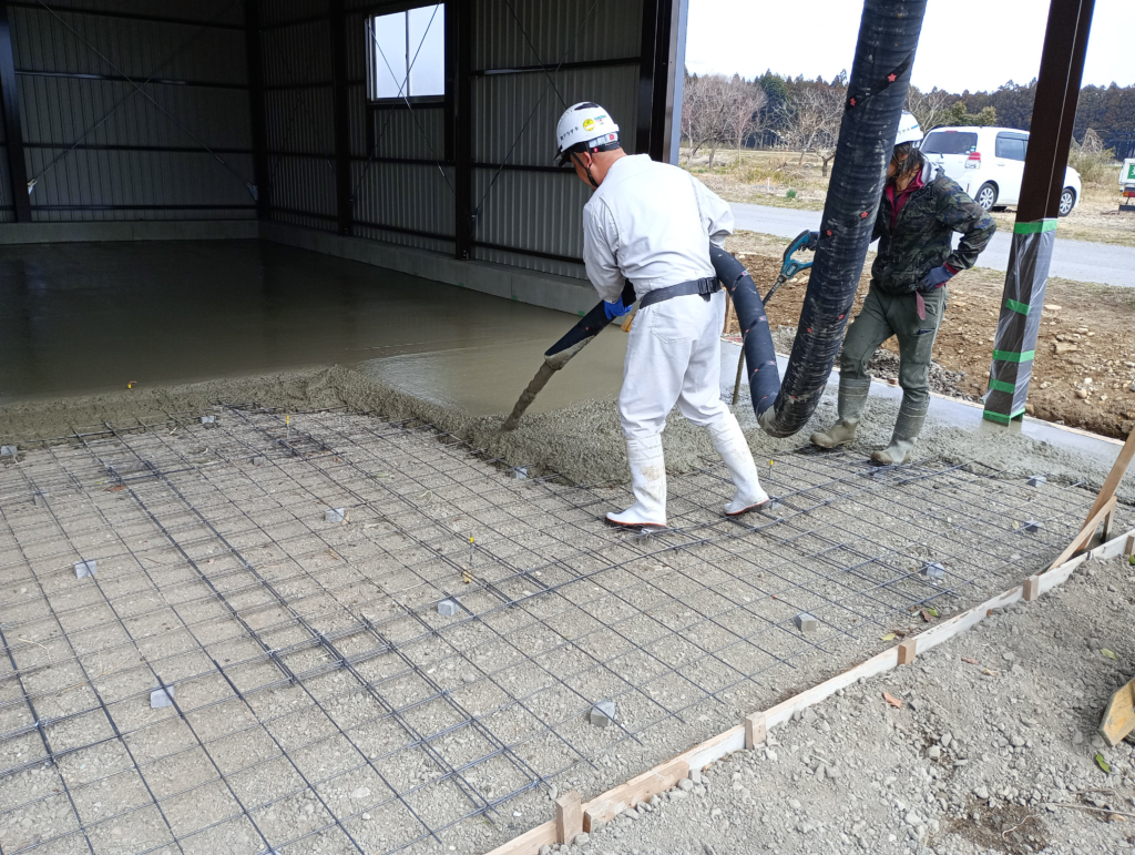 那須の酪農家さんのお宅で、カクイチ社製の鉄骨倉庫広スペースハウスの土間コンクリート工事を行いました。