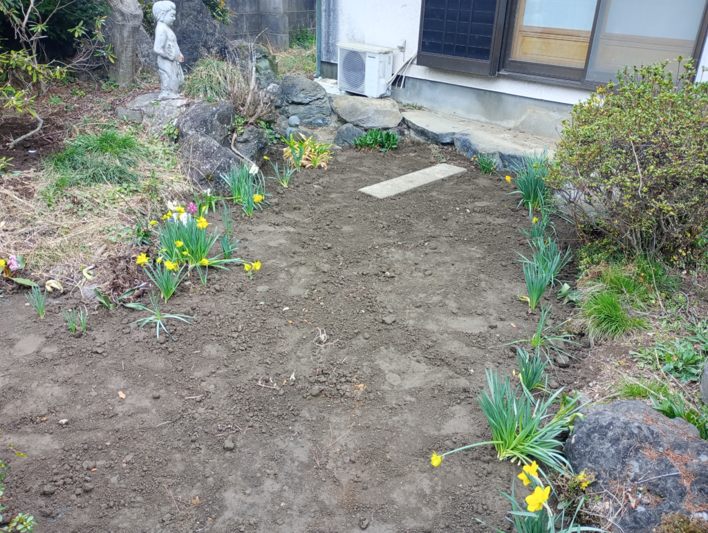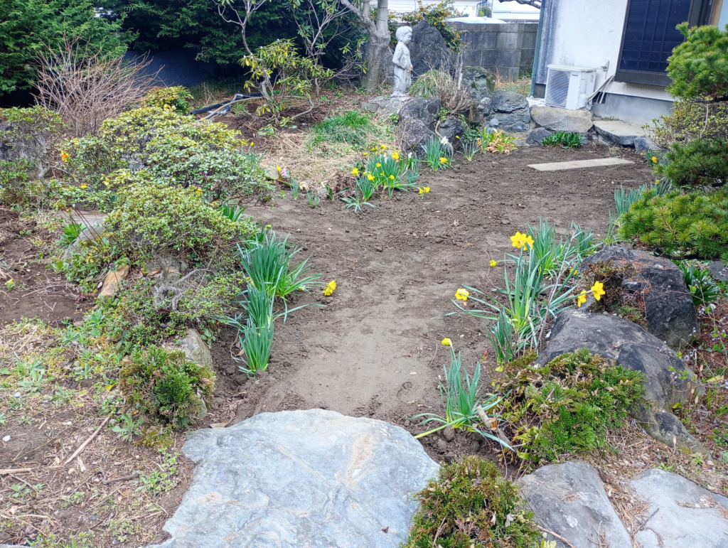 池の中に堆積した枯葉や小枝等を取り除き、代わりに黒土を入れ、スイセンを植えました。