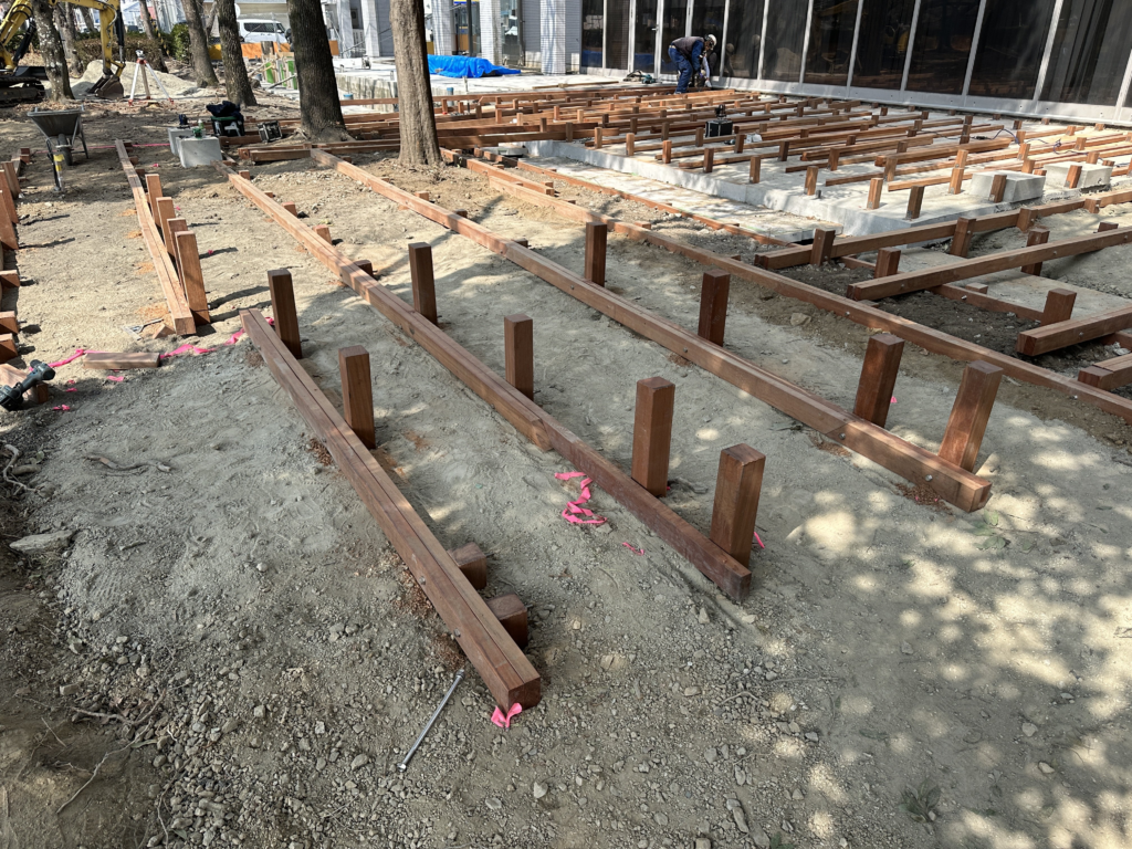 井桁基礎の上に土台、束柱が載り、大引、根太と組み上げていきます。
