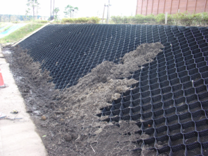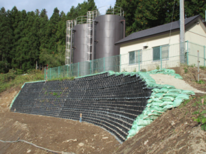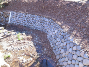 構造は、石材と背面金網をアンカー付シャフトで連結し、その内側に割栗石等を充てんすることによって自立させる重力式擁壁です。石が背面金網に固定されますので、石単体の移動や脱落がなく強固な連続壁となります。