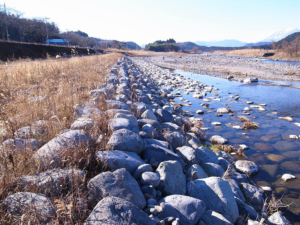 ビオトープ工法会のアンカービオストーンは、基礎以外にコンクリートを使用しない空石積み工法です。石と石の間に適度な空間ができ、動植物に良好な生息域を作り出します。