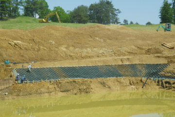 ゴルフ場内調整池の法面保護にテラセルを使用した事例です。 発生土を充てんしていきます。